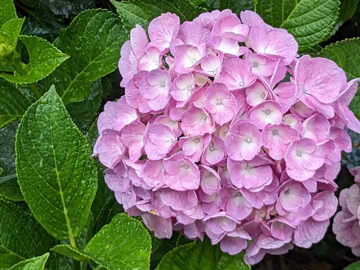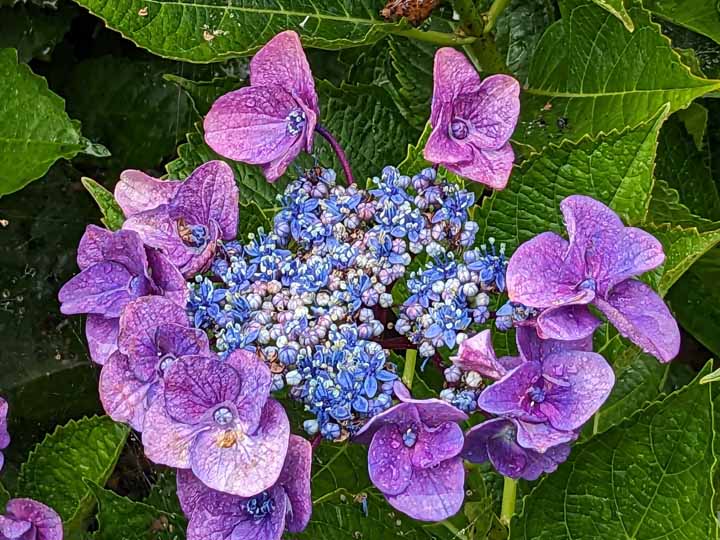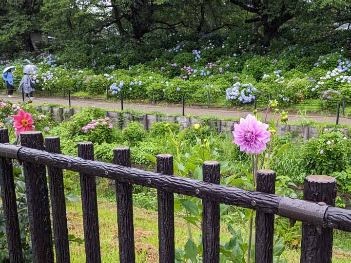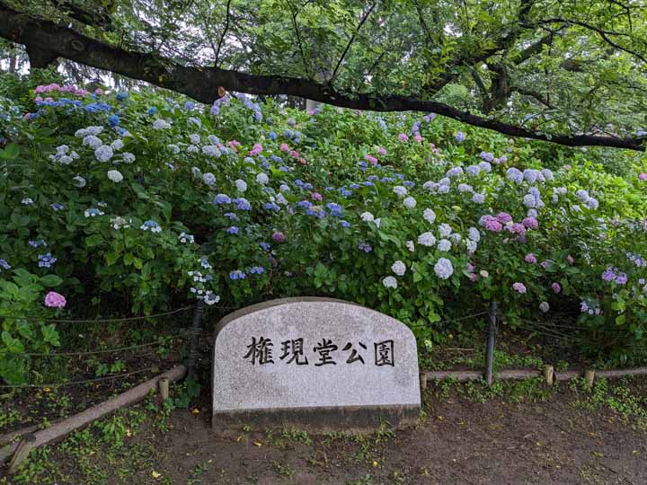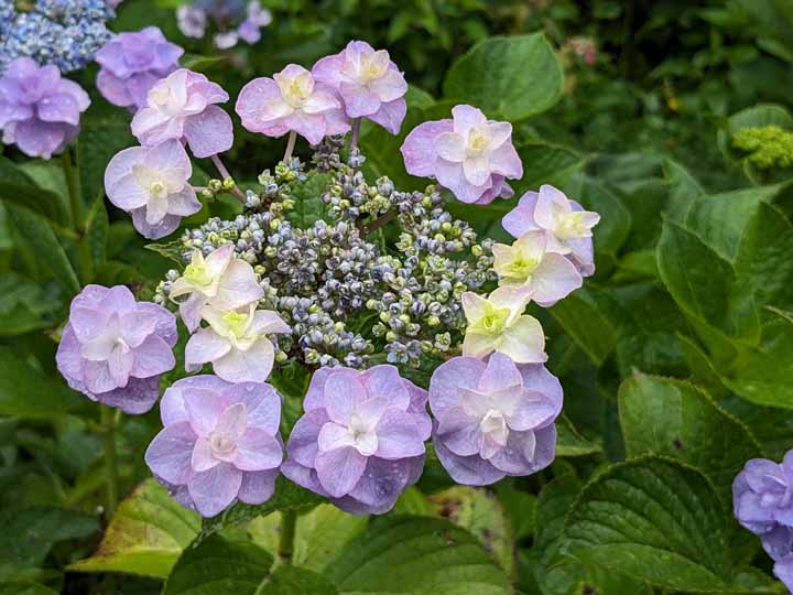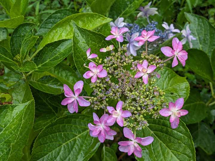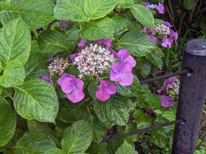 10時35分権現堂に到着した。ぼちぼち終わり頃になっており、花色の一部が茶色に変わってき始めている。こちらで一番有名な紫陽花は花色が白いアナベルという種類で、ボリューム豊かな花であった。雨が酷く降ってきたので早めにバスに戻った。