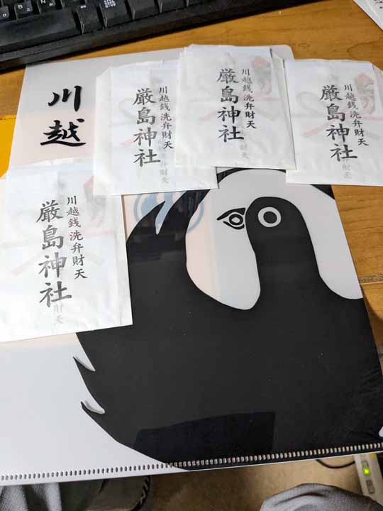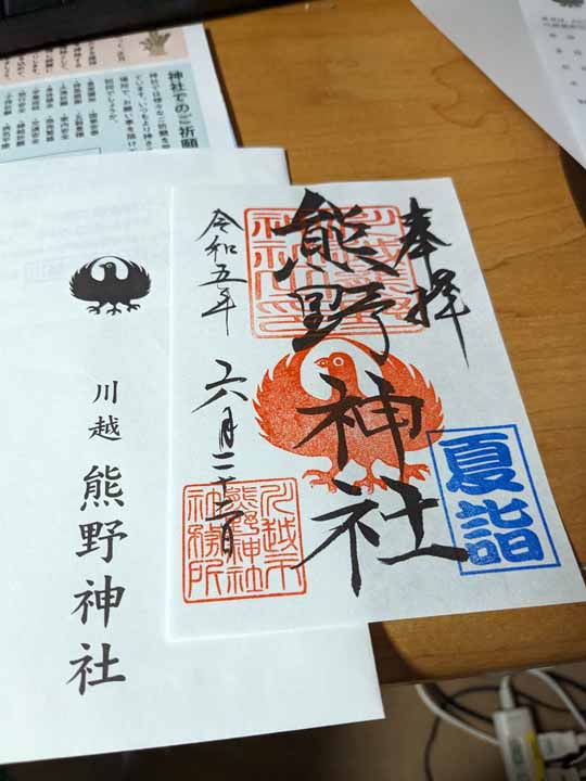 13時30分に出発して10分程で川越駐車場に入った。川越小江戸通りの突端にある川越熊野神社に参拝してきた。今回旅は参拝予定がなかったのだが、せっかくなので紙で御朱印を拝受し、銭洗い弁天もあるので、福銭4個もいただいてきた。スタッフのおばあさんがとてもやさしい方で、参拝中に雨で濡れるかもとおっしゃってわざわざフォルダーと紙袋を持ってきていただいた。