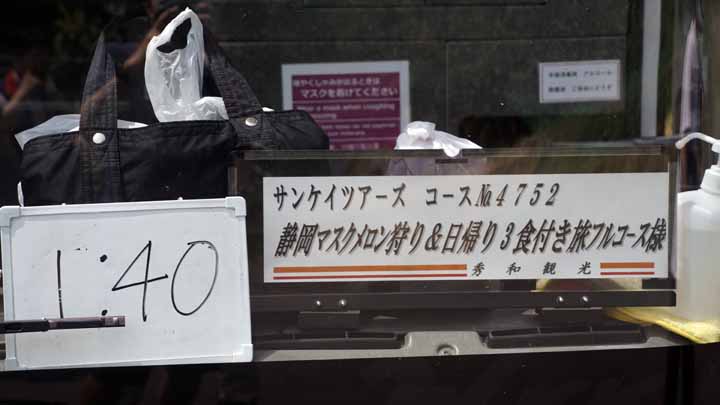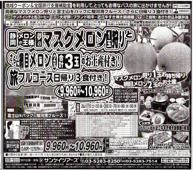 松戸(07:00)ー三津浜駿河湾クルーズー三島でメロン狩り・昼食ーめんたいパークーわさび工房ー村の駅ー沼津海産物ー松戸(18:30)