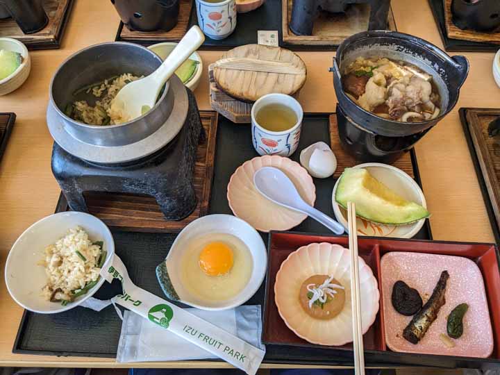 次は時間が早かったが昼食。三島塚原ICで降りて直ぐの伊豆フルーツパーク10時50分到着。すき焼き釜飯メロンの昼食でお腹が満ちた。この後、マスクメロンを刈るスケジュールだったが、状態が良くないので、マスクメロン1個と網目メロン2個をお土産にした。都合6個の6kg程の重さになった。