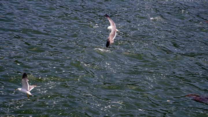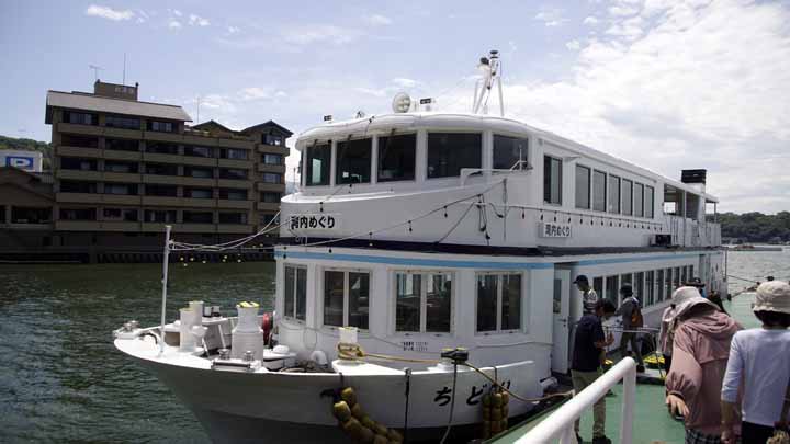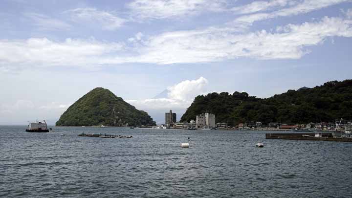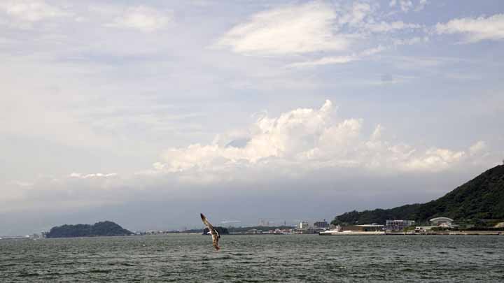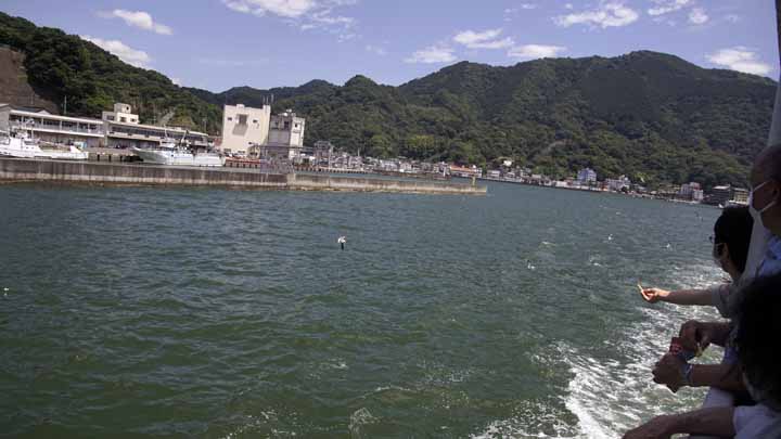 11時50分にはフルーツパークを出て12時から30分メンタイパーク伊豆で生の明太子試食をして三津浜漁港13時発の駿河湾クルーズを約25分楽しむ。今日の伊豆は最高気温が35℃を超す猛暑日が、遊覧船「ちどり」に揺られ、海風が心地よい。かもめがお客の餌に釣られて、たくさん飛び交っていた。