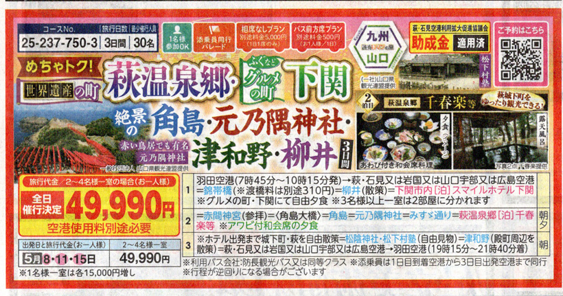 令和7年5月15日(木)〜17日(土)にかけて初めての山口県への2泊3日旅をしてきました。読売旅行社のツアータイトルは