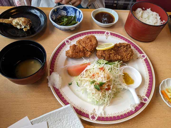 道の駅「ゆのたに」に行ったが昼食に食べたかったコシヒカリメニューが無いに等しく止むなく2q程先の17号線沿いのファミリーレストラン「モンブラン」でヒレカツ定食、お魚定食と手羽先餃子をオーダーした。定食も美味しかったが、手羽先餃子はなかなかの逸品だった。ごはんはもちろん魚沼産コシヒカ彫り物が美しいリ。