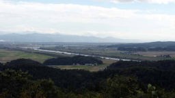 標高313mの国上山(くがみやま)にある展望台。朝日山展望台は頂上ではないが、それでも越後平野と大河津分水路が見渡せる高さに位置し、眼下に広大な越後平野と大河津分水路、遠く 越後三山までも望むことができる。