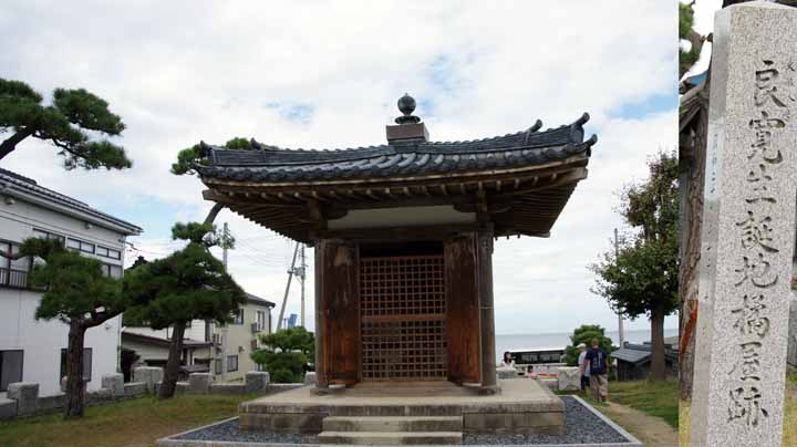 良寛堂は良寛の生家橘屋の屋敷跡(当時は現在の境内の2倍はあったという)に大正11年(1922)9月に竣功しました。堂内には良寛が常に持ち歩いたという石地蔵をはめ込んだ多宝塔に「いにしへにかはらぬものはありそみとむかひにみゆるさどのしまなり」の良寛自筆の歌が刻まれている。良寛の母の国佐渡ヶ島を背景に日本海に浮かんで見えるように設計されている浮見堂で、優美な建物である。
