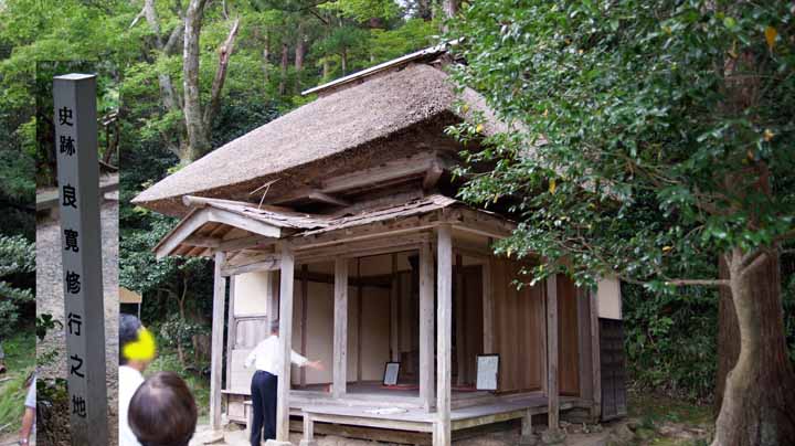 良寛が約20年間住んで、修行と芸術にいそしんだ五合庵は、明治39年(1906)の大雪で倒壊したが、大正3年7月に再建されて、現在見るごとき木造萱葺きの、間口2間、奥行9尺に厠のついた建物となった。