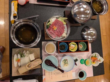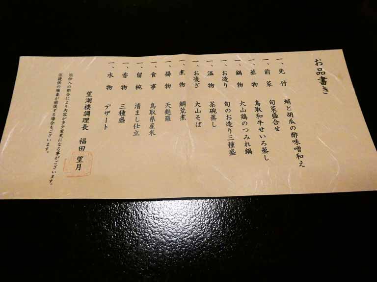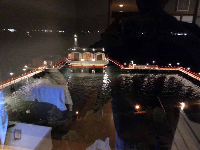 午後3時過ぎにははわい温泉「望湖楼」に到着。東郷湖(現地の人は東郷池と呼ぶらしい)も湖上露天風呂もよく見える部屋405号室にはいった。景色はとても良い。チェックイン後、夕食までの間、珈琲、アイスキャンデー、フルーツジュースなどがフリーで飲み食いできた。お風呂上がりにはビールも飲めて、お風呂に入っている間に温泉卵も出来上がる面白いシステムだったが、湖上を渡る風を受けながら夕暮れ間近の景色を観る露天風呂はいつまでも入っていられた。また来たいとおもった。6時から会席料理。鳥取和牛、新鮮魚介をはじめ13種もの料理が次々と出され、1時間も食べてるとお腹がいっぱいになった。