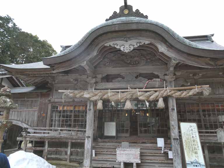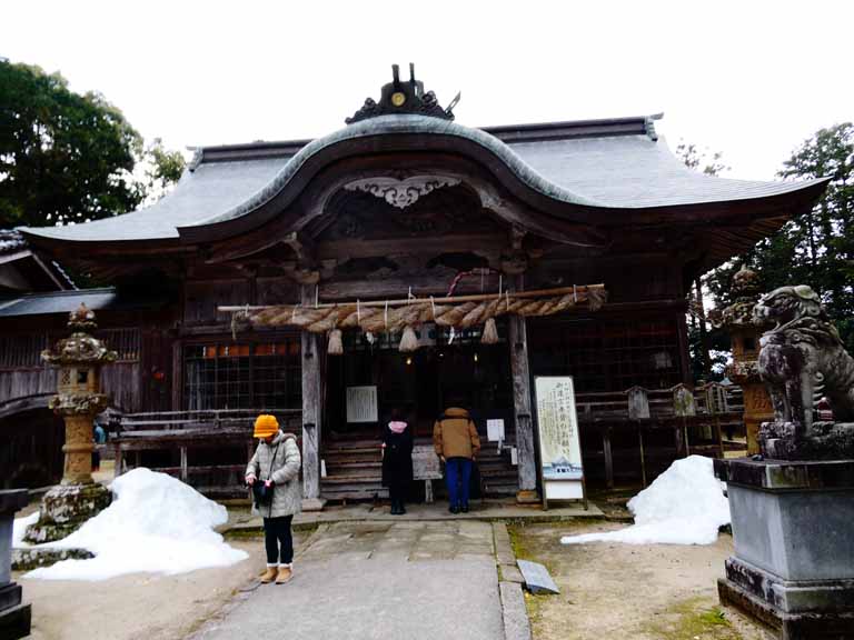 9時にホテルをチェックアウトして、大神山奥宮に向う。朝曇りで蒜山も大山も全く見えない。ただ、雪と氷で上まで行けず、麓の大神山本社神社で参拝し、ご朱印をいただく。此処は島根県米子市で、9時20分に到着し30分程参拝。10時過ぎには曇りから小雨に変わった。山陰道)国道9号線)は工事中のため米子からは現在無料区間になっており、途中道の駅琴ノ浦でトイレ休憩。10時半に出発し、ひたすら海岸沿をはしる。途中、3年前に参拝した因幡の白うさぎを祀る白兎神社が見えた。