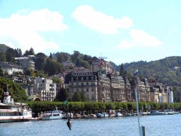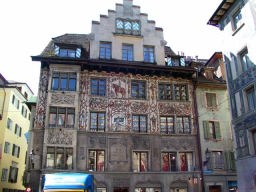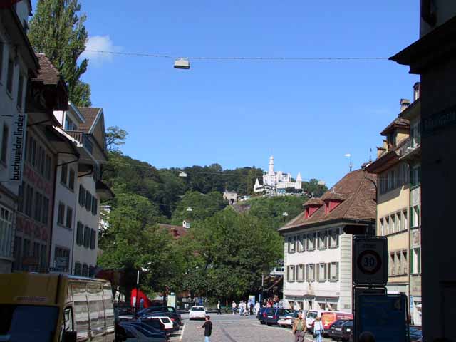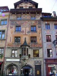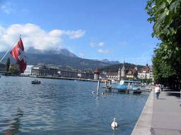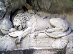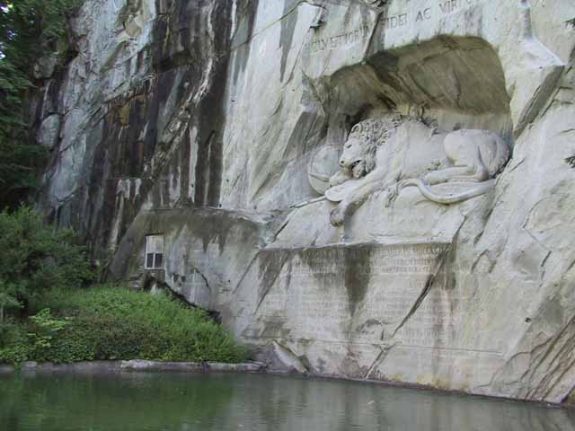 ライオン記念碑は古く十字軍の戦士の碑。緑濃い池畔の大石に彫られた眠りについてるようなライオンは荘厳。しかし、よく見ると左背中に矢が深く食い込み戦死しているライオンであり、見る者の悲しみを誘う。カペル橋周辺の建物では商店・個人宅を問わず、丁寧な壁画が彫られており、また愛犬を気軽に散歩させながらショッピングする人達も多く見られた。ドイツに近いのでラミエルに良く似た本場ダックスもポピュラーで、飼主を連れて堂々と歩いていた。