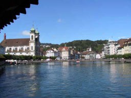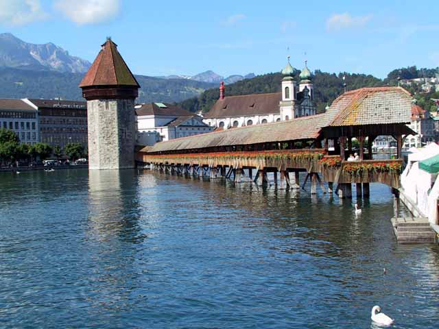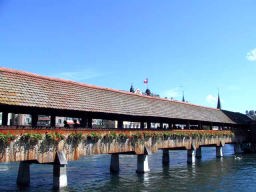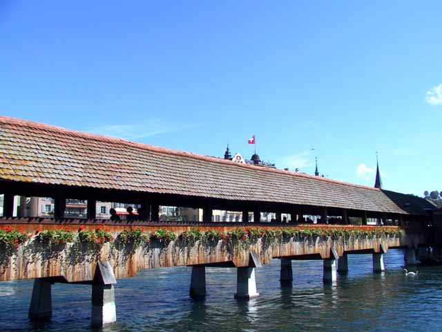 橋は、1990年頃、心無い若者の失火により半焼したが、今はご覧の通り復旧した。ヨーロッパで一番古い木造橋。橋の内部には100枚以上の板絵が掲げられている。