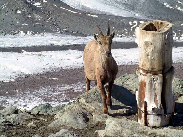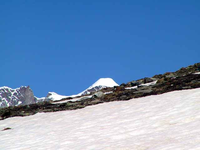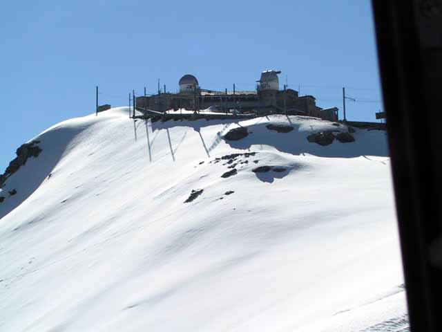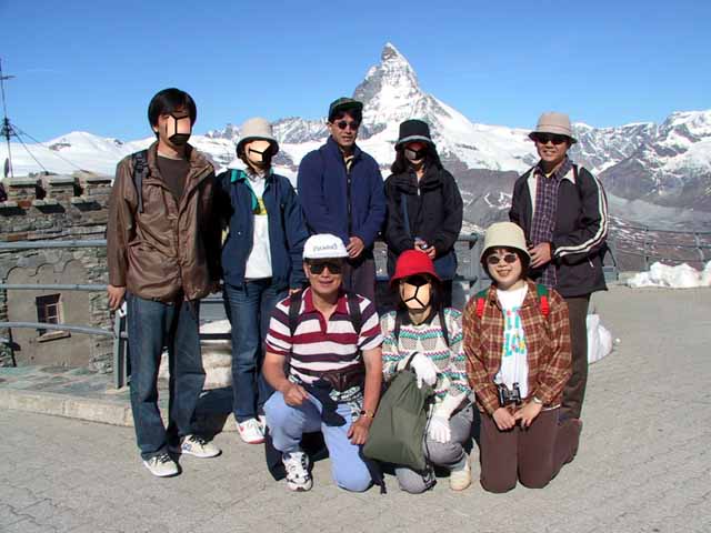 窓の景色はモンテローザ、リスカムからマッターホルンに至る3000m超の山々がいろいろな顔を見せ、カメラのシャッターは止まることなし。頂上ゴルナグラート展望台は6月中旬とは言え、雪深く滑りそうになりながら登り降りし、360度の展望を見ることができた。添乗員さんにお願いし、全員で記念写真を撮る。半袖男が私。写真撮影のサクラとしてセントベルナール犬が居たので、無料で隠し撮り。