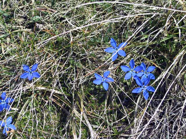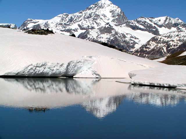 雪の道を駅から逆さマーターホルンが水面に映る場所までだけでもと、徒歩で雪の中を苦労しながら向かう。しかし、こちらも湖が氷っており、周りの石を9人全員が大小50個以上放り投げ、なんとか、ぼんやりと山の形だけは映すことができた。雪深く、年中凍りの場所でも僅かにある土には雑草花が逞しく美しく顔を覗かせる。
