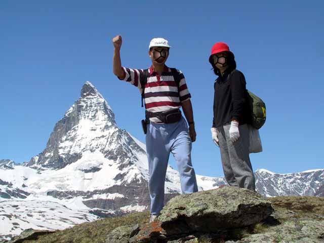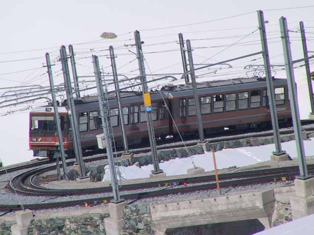 帰りは途中駅ローテンボーテンからリッフェルベルク駅まで約1時間のハイキングの予定を組んでいたが、雪深く、長いハイキングは残念ながら断念し、ローテンボーデン駅近くで昼食を兼ね、ミニハイキングをする。ワールドカップはチュニジアに2:1で完勝し予選を突破したと添乗員さんの携帯に入電し、まわりの日本人全員で歓声。また、同行者全員が時々足を膝まで雪にめり込ませ陥穽(喚声)。マッターホルンに向かっても全員でヤッホーと歓声の嵐。