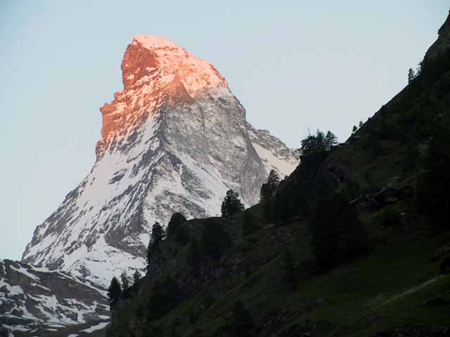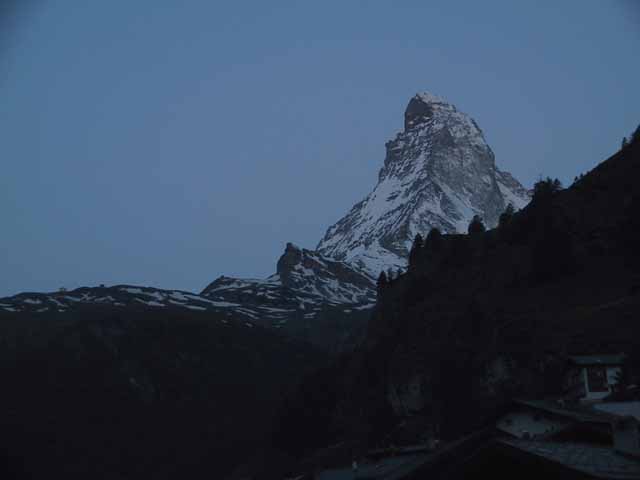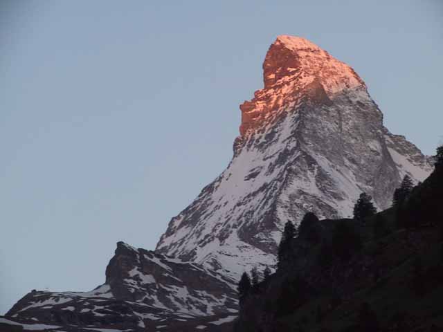 モーニングコール5:45、朝食、バゲージダウンが6:30、出発が7:00と今朝は大変あわただしい。マッターホルンの朝焼けが.綺麗と聞き、恒例の夫婦散歩も省き、さっそく写真に納める。