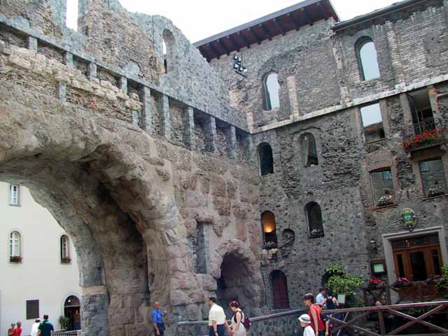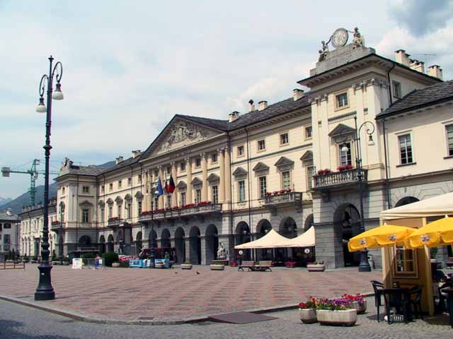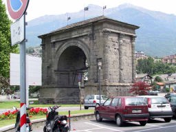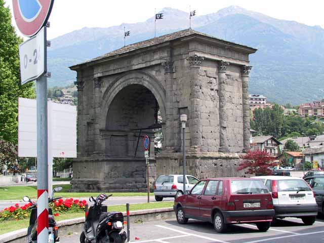 そこから、インターラーケン経由でロープウェィ乗り場まで4時間を超えるバスの長旅。トイレ休憩でラベンダーに似た花があったが、毒草「とりかぶと」とのことで、びっくり。サンベルナール峠でスイス・イタリア国境を越え、イタリアのアオスタ渓谷までバスに揺られる。イタリアは城壁が多く、町並みが古い。