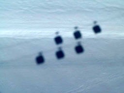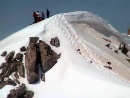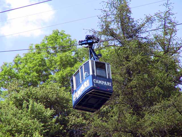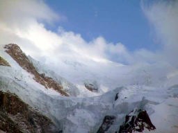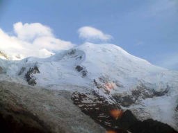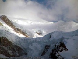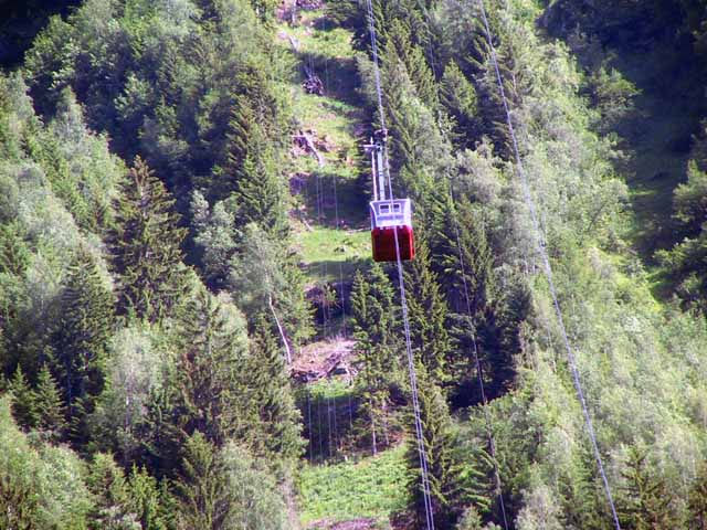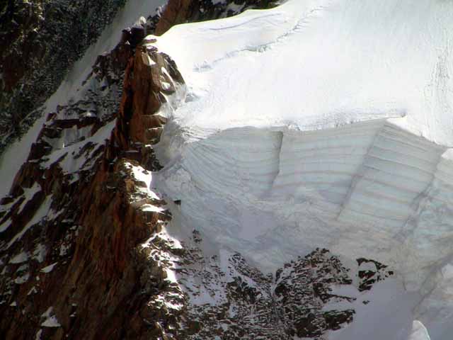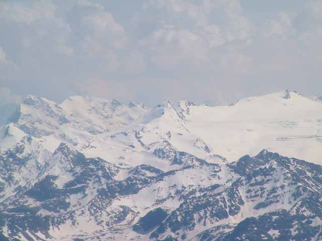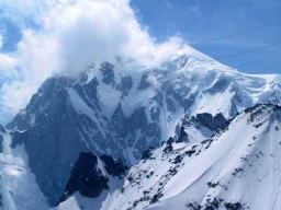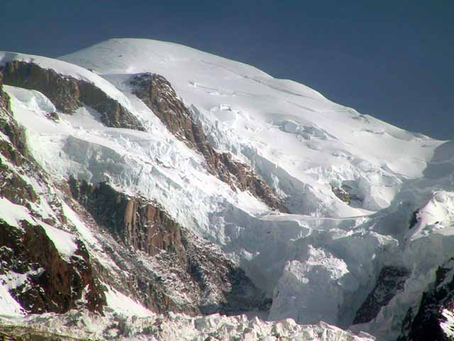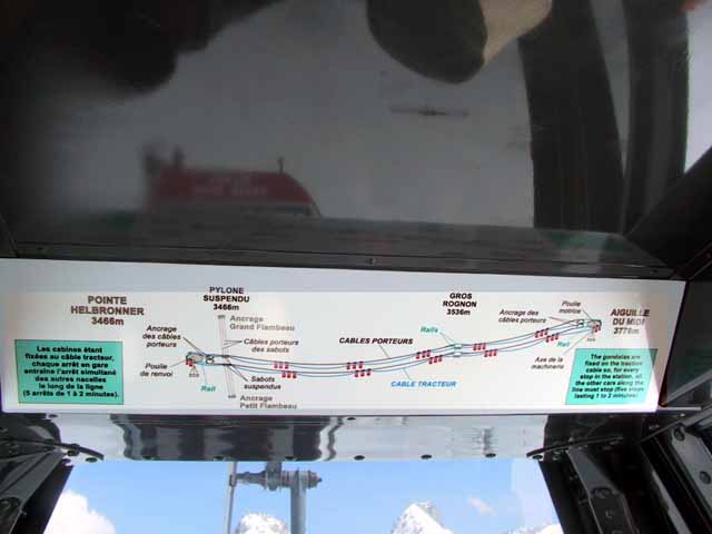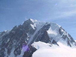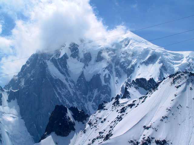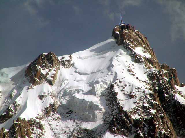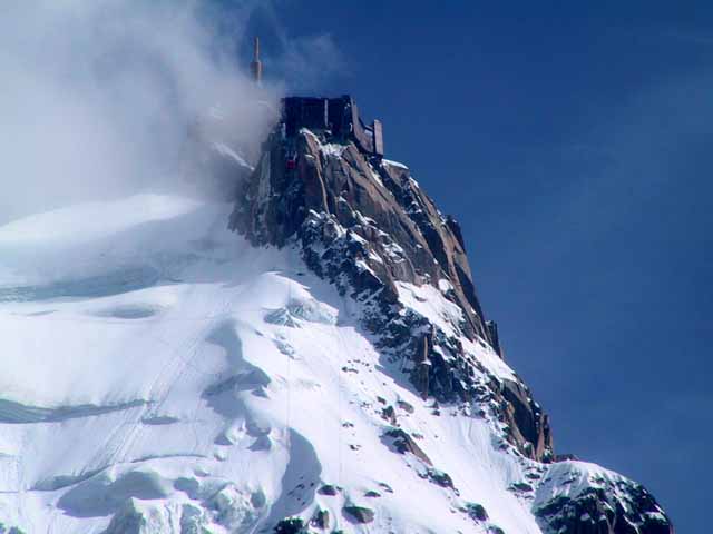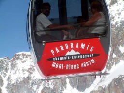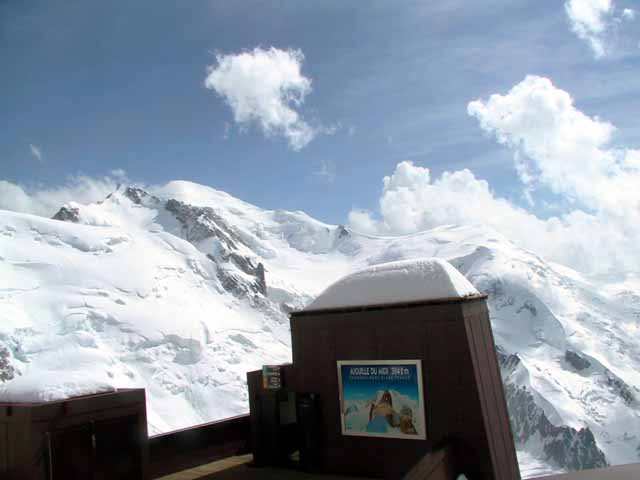 夕方3時過ぎからグランジョラスとモンブランの間にかかる5つ前後乗り継いだロープウェィの景色は秀逸であり、一面の雪景色の中に孤高として聳え立つ山々、氷河、などなど例えようもない美しさ。遥か下方には小さなロープウェイワゴンの影が見える。展望台は金網越しに下方が丸見えで、男性陣は高所恐怖症のためチョット恐ごわ。孤高のエギュドミディの'銅字塔'ほか、展望台ではモンブランを中心とした雄大なパノラマを展望できた。
