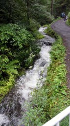 昼間の軽井沢も雨では楽しめそうもない。軽井沢散策ショッピングも止め、中軽井沢で道路を左折して白糸の滝へ。ここも若干の登り勾配だが、150メートル程なので傘をさしてゆったりと歩く。浅間山から滲みた源流地下水が、3メートル程の高さから白糸のように墜ちてゆくさまに愛子、大感動しました。連れてきて良かった。