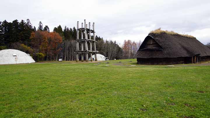 9時30分にバスは空港から出発。今回ツアー客は自由な高齢者31人。東北特有の鈍(鉛)色の曇天でまだ雪は降っていないが、10時頃から雨が降り始めてきた。10時45分に最初の観光地「三内丸山遺跡」に入り、1時間ほどの見学をした。広大な遺跡エリア、さんないミュージアム、縄文時遊館などなどをゆっくり見て回ることなどは出来ず足早に駆け抜けた。