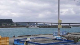 600円の入場料を払うとカートで入り口まで約300m程送ってくれ、そこから頂上まで階段(石や木や岩)を登ると360度の眺望を眺められた。今日は今冬で最低温度だそうで、現在の気温は13℃。流石に強風が肌を刺してたいへん、寒い。沖縄の人にとっては身を切る寒さだと言ってらした。城址の最上部からは360度の絶景で、海中道路や近くの遠くの島々が美しく見えた。海中道路は遠景から見るとなお美しかった。海中道路をわたりその次の島浜比嘉島で11時半だったが昼食にした。