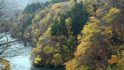 年寄りばっかりの所為か朝5時過ぎから起きだして、露天風呂へ。昨夜、露天風呂に入った時は小雨が降っていたが今日は晴れて、紅葉の赤色黄色、桧原湖と遠くの山々が風呂場から美しく、映えた。