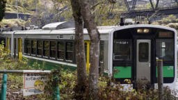 第三橋梁をみたあと、かねやま地区の告知板でで只見線を電車が12:33に通過するとのことで、30分ほど待った。時刻通りに3両編成の電車が通ってくれた。