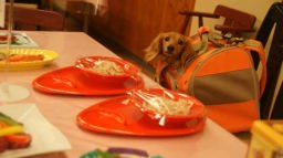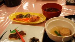 午後6時に食堂で、他のお客様のペットたちと一緒にお食事。犬の餌はボイルしたチキンと牛乳だが、ミルクは下痢が怖く普段飲ませてないのでパスをした。人間には海のものの刺身がついていたが、栃木で海のものは食べたくなかった。