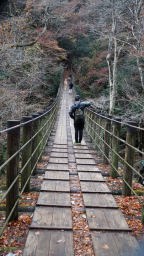 - 花貫渓谷に架かる汐見橋は、木製丸太の吊橋で、長さは60mある