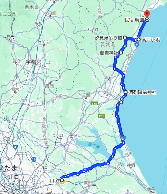 初日は平磯温泉の民宿に午後4時半前後に着けばよい。一人で2時間弱高速に乗ってもつまらないので、以下の観光地と神社仏閣に途中寄りたい。