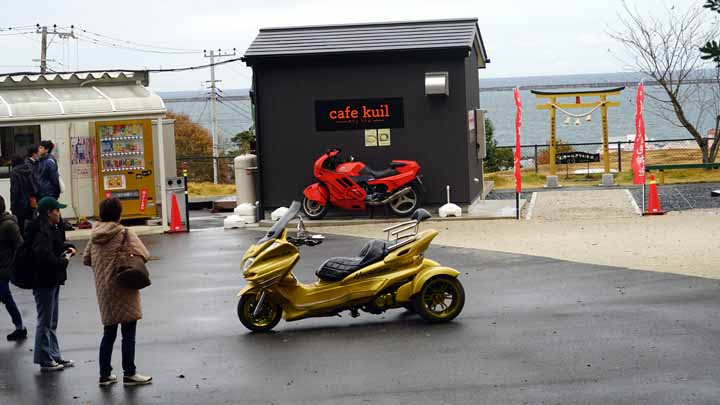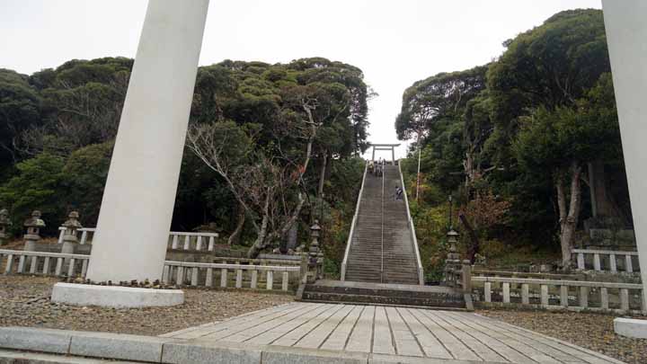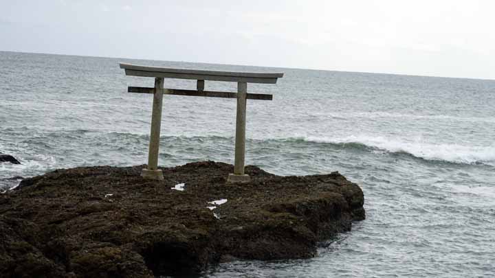 最初の目的地大洗磯前神社には10時前に到着できた。ここの名物、海の鳥居には100段以上の石段を下りて海岸まで降りなければならない。しかしながら朝陽夕陽のもとではなかったこともあるが、鳥居は思ったほどでは無かった。ここまでの走破距離は丁度100km。