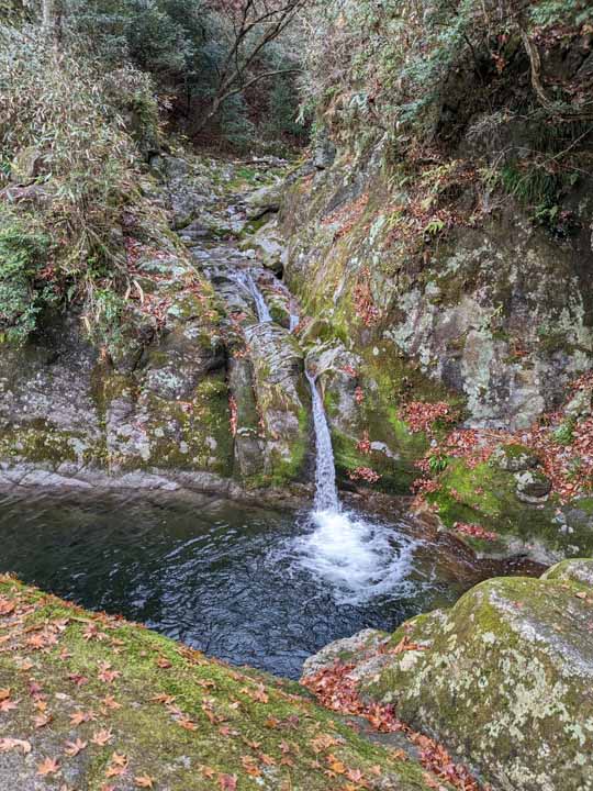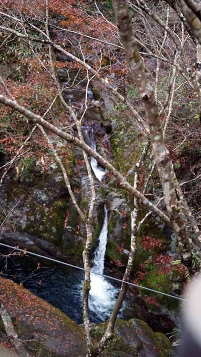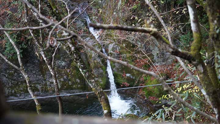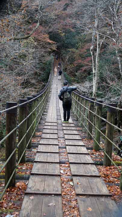 昼食を軽く済ませ、花貫渓谷の汐見滝吊り橋には2時20分頃に着いた。仲間2人はすでに到着しており、合流できた。汐見滝は水量少なかったが、美しい流れだった。吊橋の長さは60m、木製で歩くと結構揺れる。