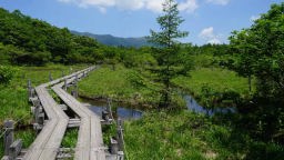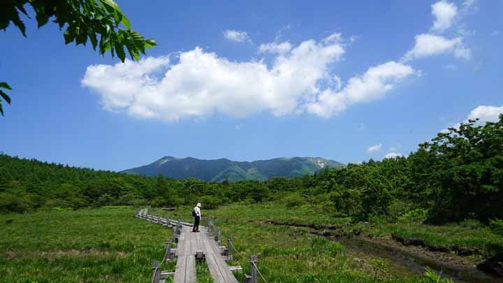 朝風呂にゆっくりと浸かった後、準備をして9時半頃に宿を出た。今朝は一番に16km先の沼ッ原湿原散策に行く予定にしている。7月初旬に信州白馬トレッキング旅に出るので、20年前に屋久島登山用に買ってその時しか使って無かった登山用靴を持ってきた。湿原駐車場には10時過ぎに到着、登山靴に履き替えて湿原まで下り坂と石段を歩いて15分。熊出没注意と目立つよう何箇所も書いてあった。湿原近くにはツキノワグマ生息地と書かれ、そこから先は危険立入禁止とも書いてあった。湿原は木道に沿って1時間弱沼や花木をめぐりながら歩いた。遠くの山も美しく見えた。