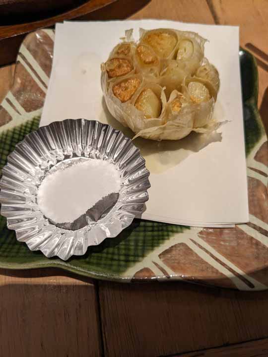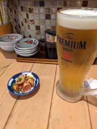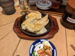午後7時48分、博多川端商店街の「餃子の龍っちゃん」で夕食。肉汁餃子、炙り明太、もつ煮込み、にんにく丸ごと爆弾揚げなどあまり食べない料理をビールのつまみとして食べた。