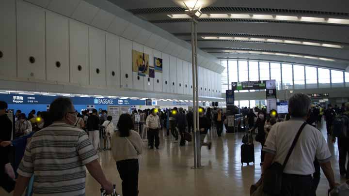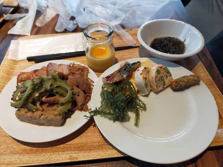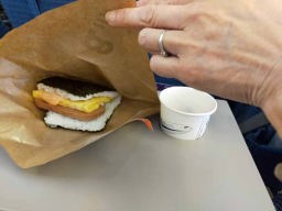 朝食で満腹だったので、お昼はポーたま(サンドイッチ店)でえび、ゴーヤ、明太などと卵、SPAMのサンドを買って、機内で食べた。思いのほか、大きなおにぎりでdachs飼主が食べた明太マヨたまは昼食には十分だった。
