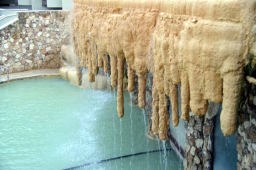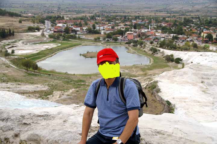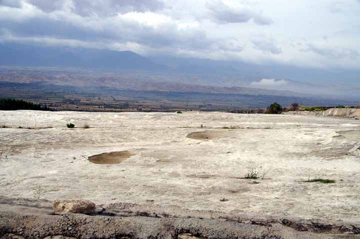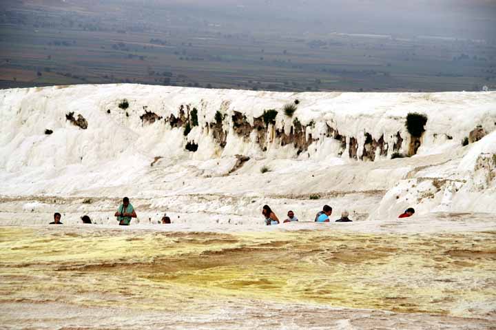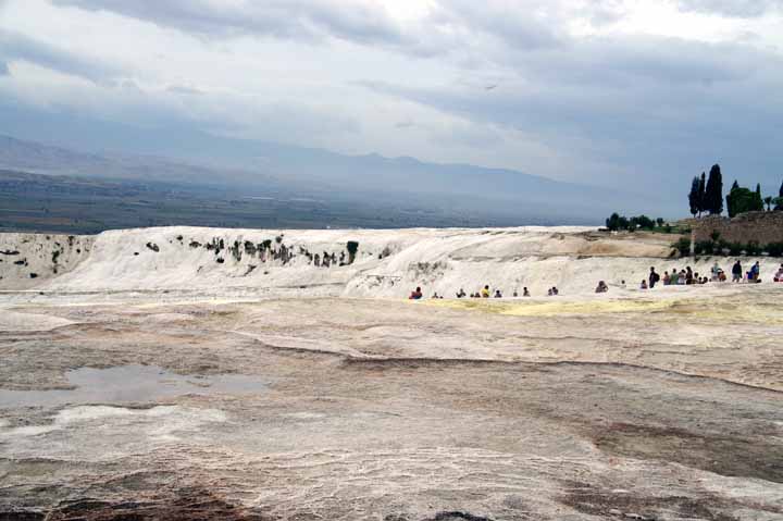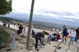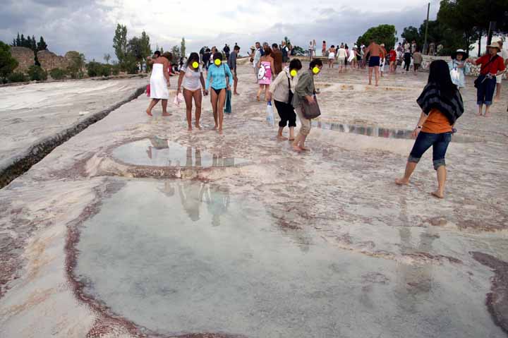 遺跡見学のあとパムッカレ石灰棚を見学。靴や靴下を脱いで足湯に入り気分爽快になった。綺麗な乳白ブルーの石灰棚『綿の城』もあるのだが、下層にあり、歩いては行けないようになっている。観光客が多すぎて、温泉や石灰棚がだんだん荒れてきているからだ。ここは世界遺産#5なのに残念だった。