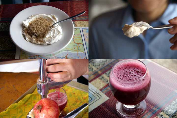 午前のトイレ休憩では「濃いヨーグルト」を食べ「ざくろジュース」を飲んだ。ヨーグルトは半端でなくコクがあり、甘くてとても美味しかった。ジュースもスィーティで大満足した。