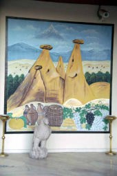 まずカッパドキアの奇岩の中で、洞窟レストランに入った。本当は洞窟ホテルも有名なのだが、Dachs飼主のツアーでは今夜はカッパドキアのリゾートホテルに泊まることになる。洞窟レストランでは、焼鱒や塩味ヨーグルトなどが出された。