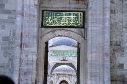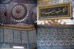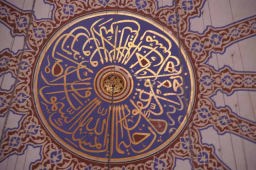 イスラム信徒の聖地はメッカであるが、イスタンブールではブルーモスクが国の聖堂として毎日観光客や信徒で賑わっている。聖堂内も観光客用には全面積の1/3しか与えられてなく、1日5回の礼拝時には、2/3部分が信徒で埋まるそうだ。ブルーモスクという名で親しまれてはいるが、鉛筆型のミュレットを6本も持つトルコの代表的寺院の名は『スルタンアフメット・ジャーミィ』と言う。ドームの200を超える窓から差し込む光が館内を淡くブルーに染めるのでこの名がある。絨毯とステンドグラス、大理石で作られた荘厳なオスマン朝建築物だ。この大聖堂の入場料は無料だが、出た所には寄付の受付場所がある。ここで寄付をすると『La Mosquee』というパンフ雑誌が貰える。上の写真はその雑誌に記載されている聖堂内の写真だ。