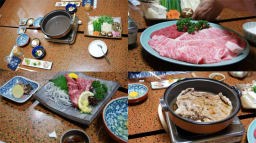 松阪には午後6時前に到着した。駅前にはマスコットの「鈴」が鎮座し、マンホールも鈴がデザインされている。今夜の宿は旅籠に近い昔風の割烹旅館。宿の女将が池坊の家元なので、部屋や廊下にすばらしい花をワンポイントで飾っていた。今夜はここで「松阪牛のすき焼きと刺身」を食べる。疲れた体をお風呂で癒し、その後午後7時から待望のすき焼きの膳についた。我が家で食べるすき焼きとの違いはうまい・やわらかい・ジューシーな牛肉意外に、調理方法にも差を感じた。