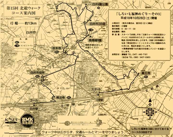 白井市民の森で秋を楽しみながらまだまだ続く土の道を快適に歩いてゆくと、秋本寺。秋本寺を出ると梨の収穫が終わった梨畑が多い。瓜の赤い実や栗の実が落ちており、いよいよ秋も本番。途中白井市役所の市民祭をちょっと見て、あとは佛法寺の寿老人を見たら、白井駅のゴールに午後1時過ぎに無事到着。記念の完歩証のほか、事務局の方から、北総鉄道タオルや、都心直通15周年青色軍手、北総ウォーク記念ピンバッジ、温泉の素、気になる野菜、ケーキ、SOYJOYなどいろいろ小物を頂戴した。