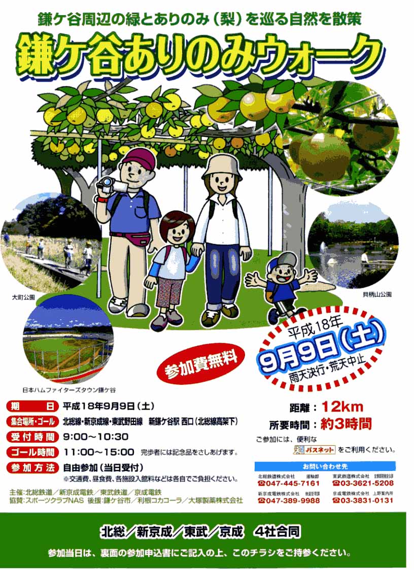 昨年9月25日に予定されていた北総/新京成/東武/京成の4私鉄が合同で主催するウォークが嵐で中止になった。それが今年鎌ヶ谷周辺散策『ありのみウォーク』して蘇る。4社合同といっても、京成だけは直通電車は走っているが、この周辺には駅や沿線はない。