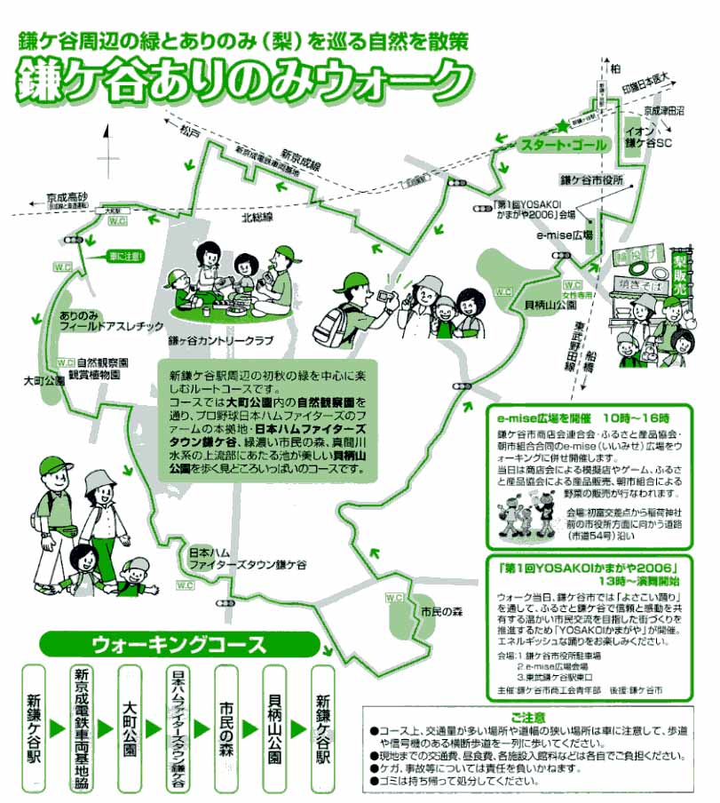 右のチラシが駅で貰った案内チラシで下左は概略のコース図。行程は新鎌ヶ谷駅ー大町植物園ー日本ハムファイターズ球場ー鎌ヶ谷市民の森ー貝柄山公園ー新鎌ヶ谷駅に至る12Kmのコース。鎌ヶ谷の緑の里山を見ながら約3時間。