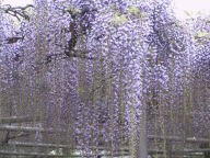 2003年4月27日(日)に、市川の高円寺に藤の花をみに行ってきました。久しぶりに当日は良いお天気になりそうな気配があり、混んではいけないと思い、朝8時過ぎに自宅をでて、20Kmくらいの距離を車で出発。中山競馬場で大きなレースがあるようで道が混み、1時間半ほどかかった。下の写真のとおり、まだ、花は爛漫といえず、5月上旬が見ごろと露店のおばちゃんに聴きました。1日に藤の花は5センチぐらいづつ延び、盛りになると下の藤が地上にくっつくほどになるそうです。