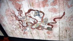 午後1時に本埜小を出発し、小一時間歩くと、栄福寺薬師堂に着いた。薬師堂のご開帳は33年に一度しか開かれず、次回は平成29年とされている。今回のウォーキングで市からの働きかけがあったのか一部を開けていただき、天井の絵を見せていただいた。絵は楽器を奏でる天女だそうで3枚の図柄があった。その他、左甚五郎作の絵もあったようだが、ホントウかどうか判らなかった。