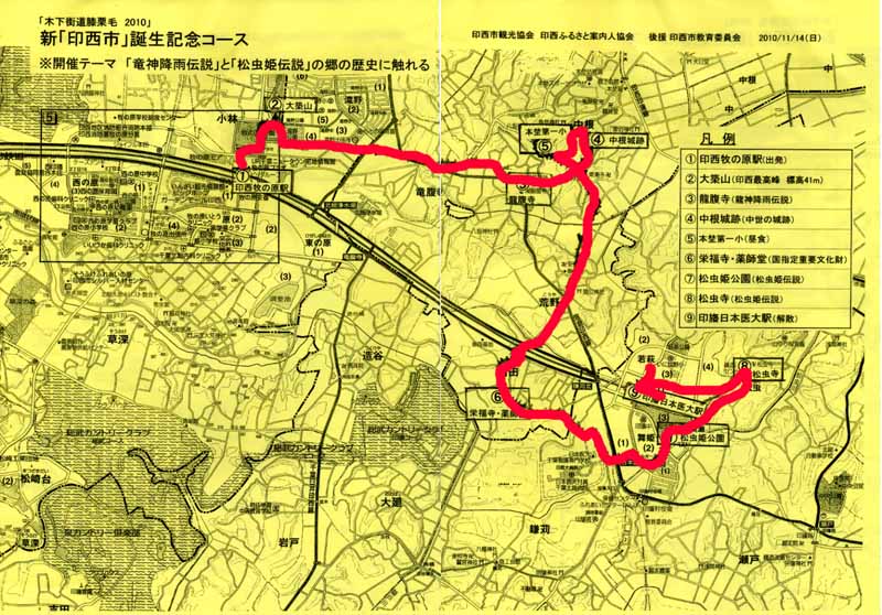 今までは通称木下街道(県道59号市川印西線)を中心とした丁寧な観光説明・簡単接待付きのウォーキングだが、今回は「新印西市誕生記念コース」として2010年7月17日、印西市に入った旧印旛村と旧本埜村を巡る散策となった。開催テーマは「竜神降雨伝説と松虫姫伝説の卿の歴史に触れる」となっている。