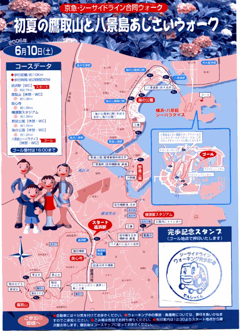 平成18年6月10日(土)に昨年とメインの一つは同じの八景島あじさいウォーク。今年は昨日6/9に梅雨入りしたばかりで、行けるかどうかが微妙だったが朝起きると晴れていた。去年はアジサイをたくさん撮ったが今年はデジタル一眼でどれほど撮れるかが試したくって再挑戦。また、初めての鷹取山散策も目玉である。京急のウォークは距離は10〜15Kmと並のコース設定が多い。しかしながら、坂・階段などの傾斜がきついので結構へばる。逆に良いところは海山川が千葉と違い豊富なので、緑の山並みと海の青が開けていることであろうか。今回は京急とシーサイドラインの合同ウォークとなる。