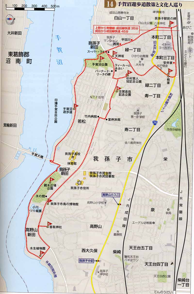 ***下の地図はクリックで大きくなります(ズームアップすると良く見えます)*** 平成17年6月25日(土)は朝から梅雨の晴れ間。何とはなく、我孫子の手賀沼に行って見たくなった。我孫子の市役所まで走り、そこに車を停めて、水の館から鳥の博物館、香取神社、水生植物園、親水公園へ。そこから手賀沼大橋の下を潜って、手賀沼遊歩道、文学の道、手賀沼公園を経て我孫子駅へ。我孫子駅で右側に折れイトーヨーカドーの前から志賀直哉記念公園を通ってスタートの我孫子市役所駐車場まで約3時間、6キロメートルくらいのコース。