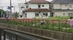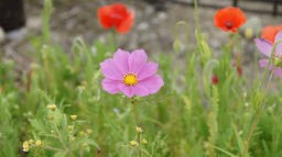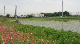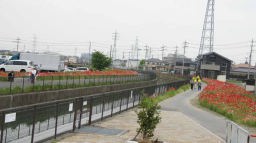 この疎水、葛西用水路の両脇は「コスモスロード」と名づけられていた。春ポピーが終わると町がコスモスを植えて秋も賑わうのだろうな、と思った。途中、違和感を感じる花を数輪見つけたので、近寄ってみるとナント コスモスの花が咲いている。