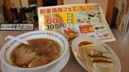 ポピー畑を堪能した後、時計を見たら12:30。大きな看板が遠くから見えたので、100mほどコースを離れて「昭和29年創業中華そば290円」の店に入ってチャーシュウ麺と餃子を食べた。餃子100円セールだったので、良かった。