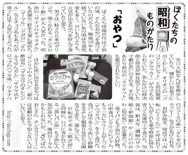ぼくたち団塊世代は子供の頃、どんなおやつを食べていたのだろう。戦後10年も経っていないあの頃は欠食児童も多く、甘いものよりも、元気が出るおやつを好んで食べていたと思う。