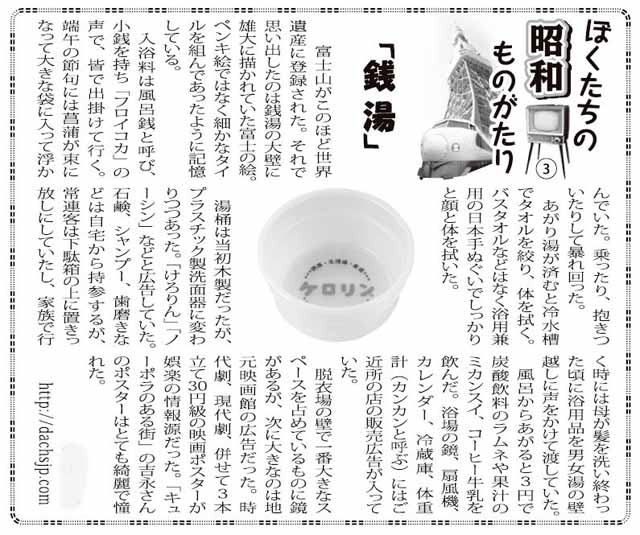 風呂からあがると3円で炭酸飲料のラムネや果汁のミカンスイ、コーヒー牛乳を飲んだ。浴場の鏡、扇風機、カレンダー、冷蔵庫、体重計(カンカンと呼ぶ)にはご近所の店の販売広告が入っていた。
